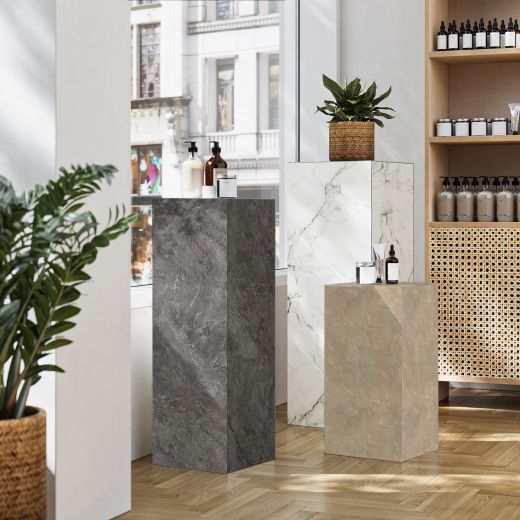 - Use Height to Guide the Eye: Pedestals of varying sizes create visual hierarchy, highlight best-sellers, and make displays feel dynamic.